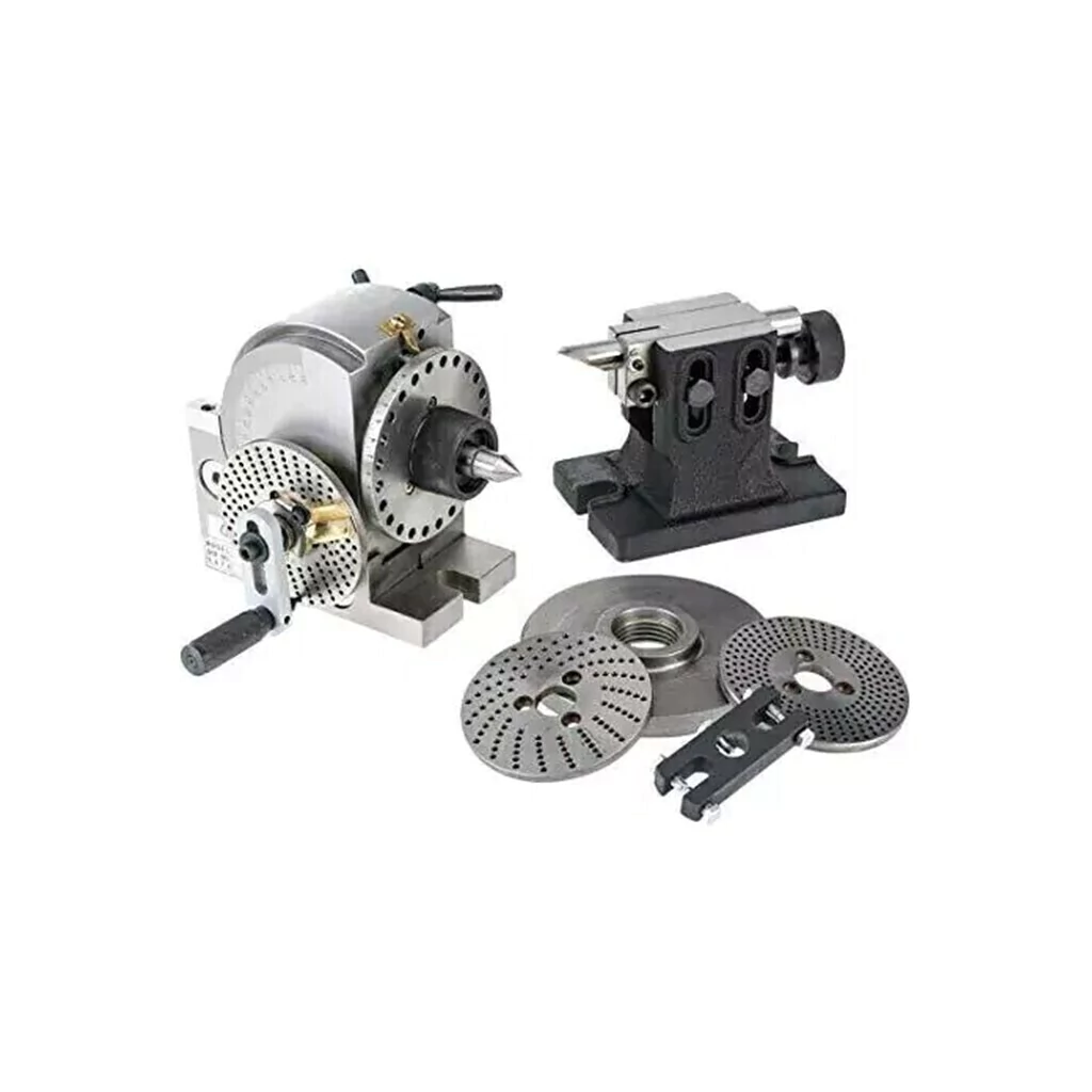 O Divisor semi-universal modelo VB-BS-0 tem no eixo-árvore, rolamentos cônicos. Tanto o sem fim quanto o eixo árvore são retificados e temperados. O cabeçote giratório pode ser travado a partir de -10º até 90º. Seu encaixe preciso com a base assegura uma rotação suave. Todos os modelos têm um encaixe rosqueado no eixo árvore e acompanham discos divisores de 24 furos com fácil conversão para indexação direta nos números 2, 3, 4, 6, 8, 12 e 24. Pode dividir em qualquer ângulo de maneira direta e indireta. A razão entre o sem fim e a coroa é de 1:40. Com elevada precisão, pequena folga, aparência fina e estrutura forte, assegura-se uma rotação suave. Acessórios Standard: 02 discos divisores, 01 contra-ponta, 01 ponta fixa e 01 arrastador. Acessórios opcionais: Placa universal de 130mm.