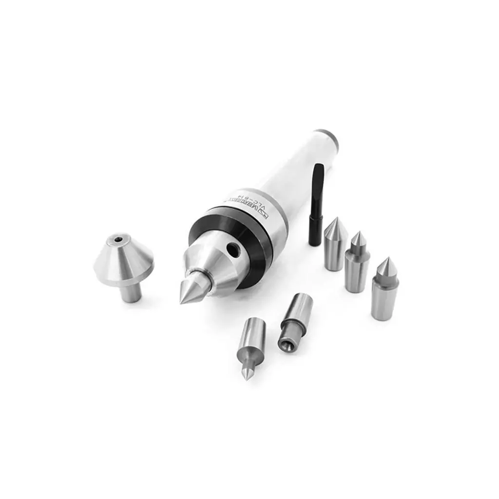 A ponta rotativa com pontas intercambiáveis para rotação máxima de 1.600rpm com haste CM-3 Acompanha 06 pontas. Concentricidade de +/- 0,008mm Com rolamento de alta qualidade Pressão do contra-ponta sugerida : Abaixo de 6kg/cm2