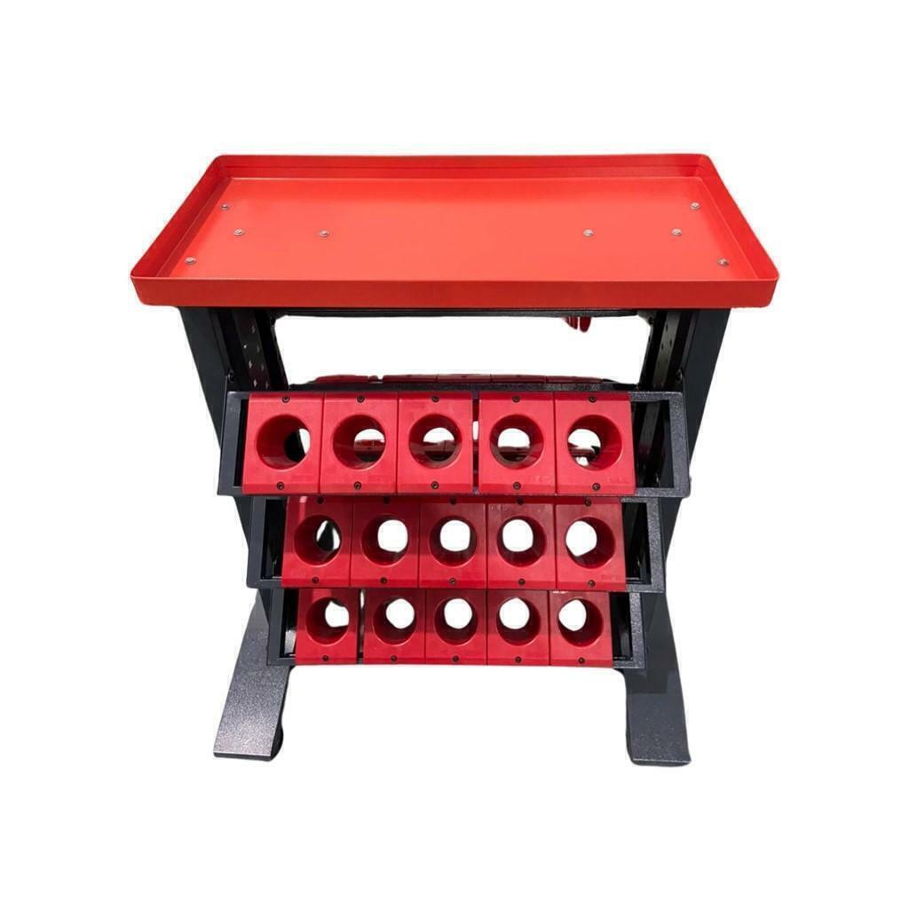 Porta cones tipo rack com alojamentos para 30 cones BT-50, SK-50 ou ISO-50 Dimensões de 800 x 660 x 930mm e a bandeja tem medida de 730 x 340mm Com pés emborrachado e com regulagem de altura.